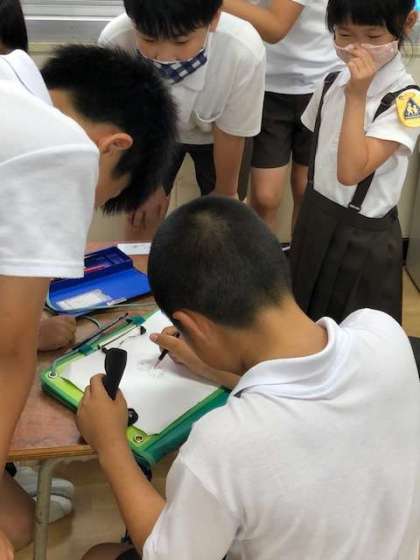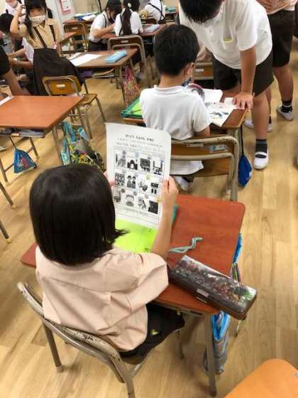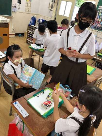 学校たんけんから早く戻ってきたペアは、1年の教室で、カードゲームをしたり6年に絵をかいてもらったりして楽しく遊びました。