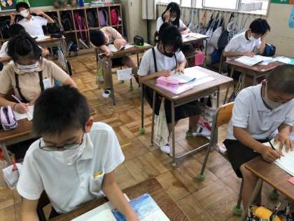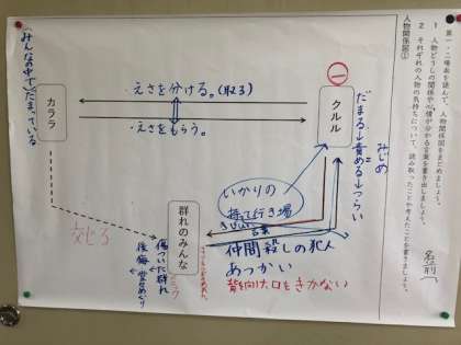物語文「風切るつばさ」の学習では、人物関係図で1、2場面を整理しました。文の主語に気をつけながら、行動を整理していきました。