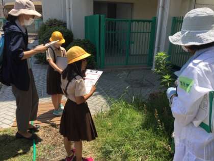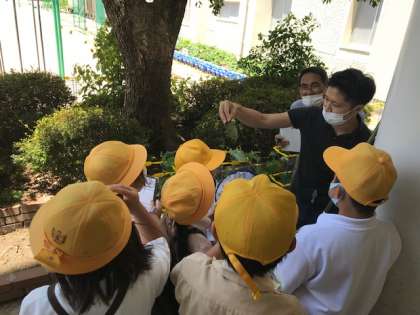 グループに分かれて、ビオトープや学習園、第2グラウンドにいる生き物をさがしました。生き物の名前や特徴を教えていただき、楽しく学習しました。