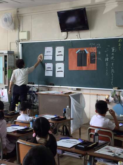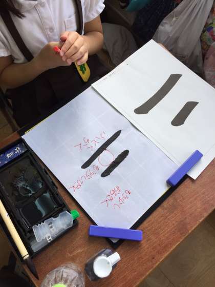 初めて書く文字は「ニ」です。手本を見ずに書いて、その後手本を見てどこを直したらよくなるか、一人一人の課題を見つけ、赤ペンで書き込みました。何枚か練習し、初めの字と比べてみました。みんな課題をクリアできています。