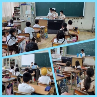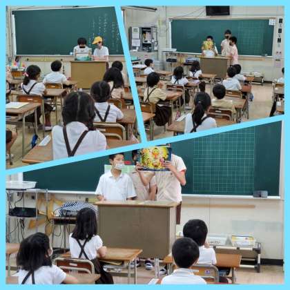 毎週金曜日の8時半から15分間は、読書タイムです。2週間に1回、図書委員会児童が低学年の教室を回って紙芝居や大型絵本の読み聞かせをしています。読み聞かせが終わったら好きな本を読んでいます。読書好きの子どもたちが、たくさん増えることを願っています。