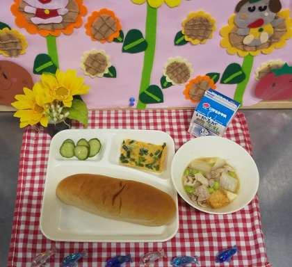 今日は、豚肉と野菜の煮もの、チヂミ、きゅうりの甘酢あえ、黒糖パン、牛乳でした。チヂミは日本のお好み焼きに似た韓国朝鮮の料理です。給食では、大きな鉄板に入れて大型焼き物機で焼き上げたものを切り分けています。子どもたちに大好評でした。