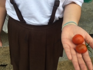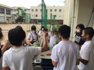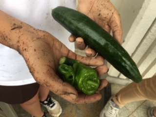 第一月曜日の6時間目は、5.6年生の委員会活動の時間です。小雨の中、雑草を抜いて、できた野菜を収穫し、みんなで分け合いました。