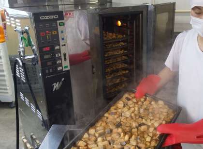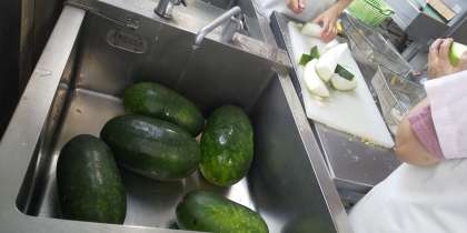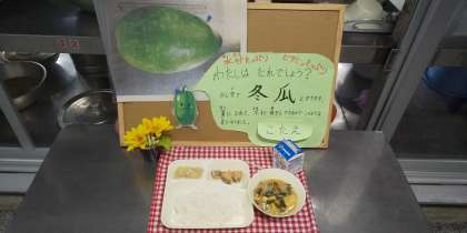 今日は、さけのつけ焼き、みそ汁、とうがんの煮もの、ごはん、牛乳でした。とうがんは、今が旬のビタミンと水分を多く含む野菜です。冬まで保存できるので冬瓜という字を書きます。「大根みたい」と言って子どもたちもよく食べていましたよ。食感は蕪によく似ています。