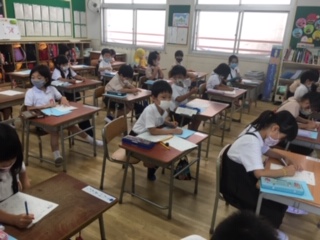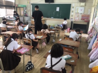 水曜日の朝の時間(8時半から45分)は、漢字や文字、計算など基礎基本の力をつける時間です。全校で取り組んでいます。1年生は、ひらがなの練習をしていました。終わったら好きな本を読んでいます。