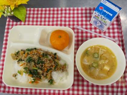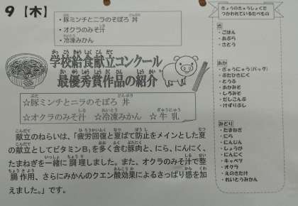 今日は昨年度の献立コンクール中学生の部で最優秀賞に選ばれた献立です。豚ミンチとニラのそぼろ丼、オクラのみそ汁、冷凍みかん、牛乳でした。「疲労回復と夏バテ防止をメインとしてビタミンB1を多く含む豚肉と、その働きを促進し、糖質を素早くエネルギーに変えるにら、にんにく、たまねぎを一緒に調理しました。オクラのみそ汁で整腸作用、さらにみかんのクエン酸効果によるさっぱり感と疲労回復、夏バテ防止を考えました。」というねらいを放送で委員会の児童が伝えてくれました。1年生は初めての冷凍みかんに「冷たい!」と驚いていました。