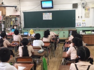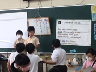 学年のカリキュラムに沿って、繰り返し声に出したり、体を使ったりして英語を楽しんでいます。