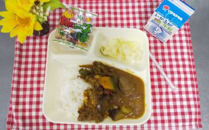 今日は夏野菜のカレーライス、キャベツのサラダ、豆こんぶ、牛乳でした。給食室にはたくさんの夏野菜が届きました。カレーに入っている夏野菜分かりますか?かぼちゃ、なす、トマト、ピーマン、セロリなどです。野菜が苦手な子も「カレーに入ってたら食べれた!」と話してくれました。