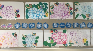 色とりどり、いろんなアジサイが咲きました!廊下や教室に掲示しています。