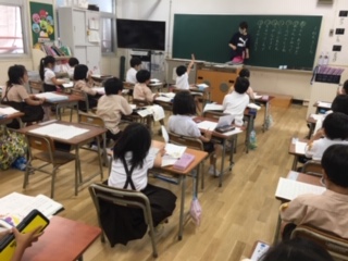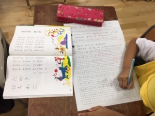 教科書の「あひるのあくび」に倣って、自分でも考えました。あ行でも、頭につく言葉が「あ」でなくいろいろです。韻を踏んでいたり、オノマトペを使ってリズムがあったりと、子どもらしい発想に驚かされます。たくさん作りました。