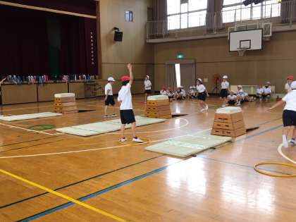 昨日、講堂で跳び箱をしました。3年生では、台上前転に挑戦します。まずは、基本の開脚跳び。前の人が手をあげて合図をしてから、次の人が出発です。ルールを確認して、怪我のないように気をつけます。