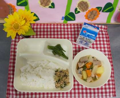 今日は、豚肉とじゃがいもの煮もの、オクラの梅風味、ツナっ葉いため、ごはん、牛乳でした。給食ではふりかけも手作りで用意しています。ツナと大根の葉で作る栄養満点のツナっ葉いためは、ごはんも食べやすく子どもたちにも大好評です。