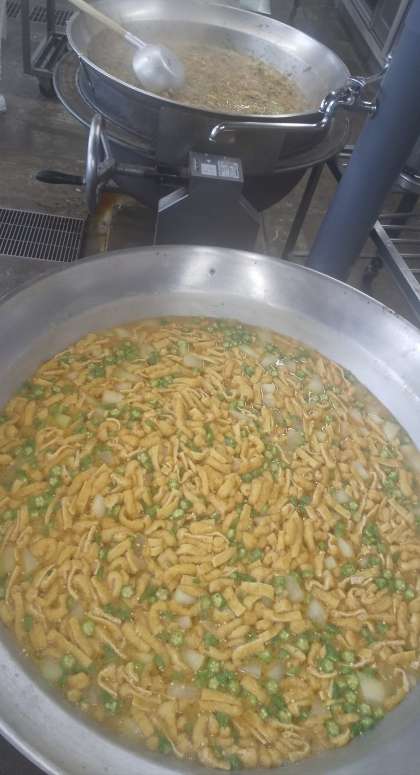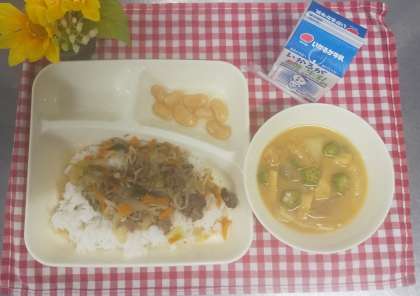 今日は、牛丼、とうがんのみそ汁、大福豆の煮もの、牛乳でした。牛丼の具とみそ汁は大きな釜で、煮まめは焼き物機で蒸し焼きにして作ってくれました。大福豆はおなかの調子を整える食物せんいを多く含みます。豆が苦手な子も多いですが、「甘かった」「おやつみたいだった」とチャレンジしているようでしたよ。