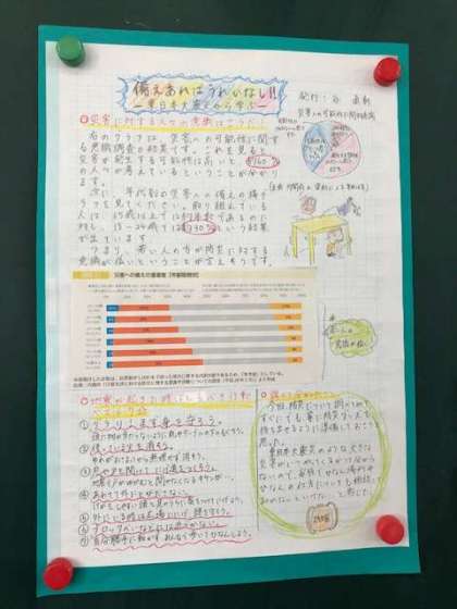 指導者が作ったモデルとなるポスターをもとに、工夫したキャッチコピーや出典を明らかにしたグラフ、レイアウトの工夫などを意識しています。