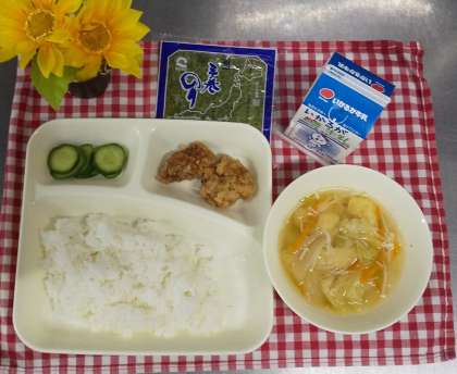 今日は豚肉の香味あげ、すまし汁、あっさりきゅうり、手巻きのり、ごはん、牛乳でした。給食室で下味をつけて丁寧に衣をつけて揚げた香味あげは大人気でした。