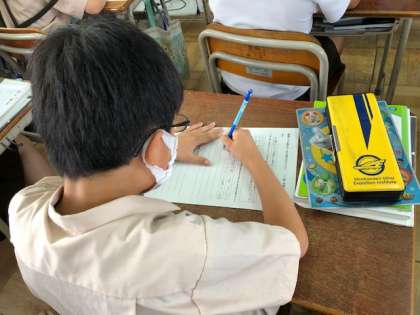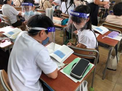 5限に今年度初めての研究授業ということで、K先生が説明文「動物たちが教えてくれる海の中のくらし」の授業を行いました。非連続テキスト(教科書の図)から海の中の生物の体の大きさと泳ぐ速さの関連について読み取り、筆者の挙げた具体例に対して意見をワークシートに書き込みました。フェイスシールドを装着して、ペアで交流し、全体で考えを深めました。どの子どもも、しっかりと根拠を示しながら自分の意見を書く力が少しずつ高まってきています。