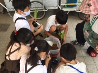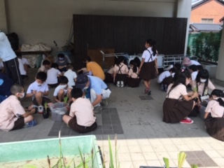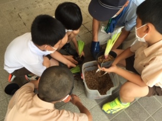 4〜5人ずつのグループに分かれて株を植えました。小さなポットに、菖蒲の二つの株をヤシの葉で出来たひもでくくつたものを入れていきました。自分の名札をポットに挿して出来上がり!