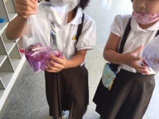 アサガオの花がたくさん咲きました。色水を作って遊んでいます。袋を揉んでいくと、色がだんだん濃くなっていることに気づきました!