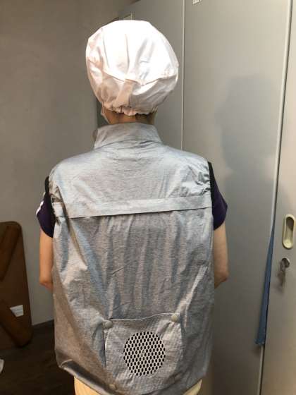 大宮小学校の給食室では、調理員4人で小学校465人分と今市中学校3年生145人分合わせて600人分以上の食器などを午後から洗浄しています。高い熱気と湿気の中で少しでも安全に作業ができるように今日から空調服を着用できるようになりました。