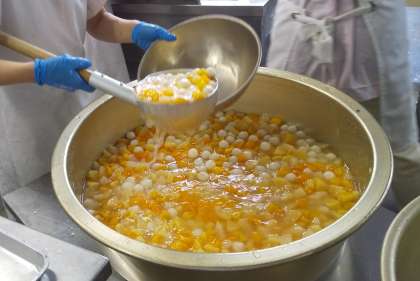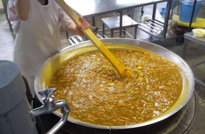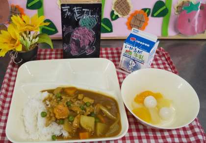 今日はチキンカレーライス、フルーツ白玉、牛乳でした。大きな釜で作る給食のカレーは子どもたちに大人気です。可愛らしい形に切ったラッキー人参も用意してくれました。大型焼き物機で蒸した白玉団子とミックスフルーツの缶詰を手作りのシロップで合わせたデザートは大きなたらいでしっかり混ぜ合わせて作っています。