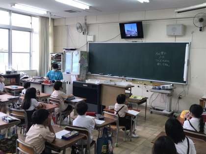 今朝は運動場がぬかるんでいたので、放送で朝会を行いました。
