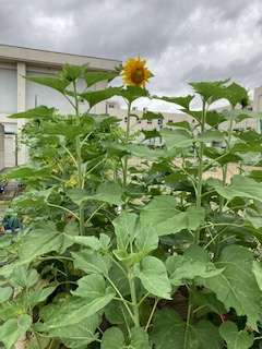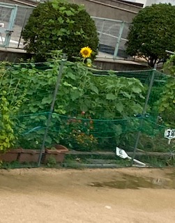大きなひまわりが咲きました!遠くから見ると、ひまわりが帽子のように見えますね!