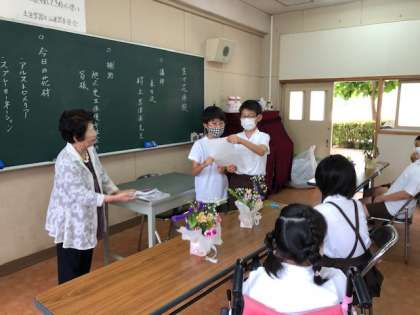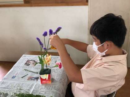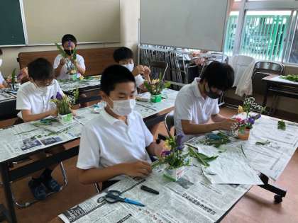 今日の2時間目に各学級で生け花体験を行いました。生け花の先生や旭区更生保護女性会の方々に教えていただきながら、子どもたちは思い思いの花の挿し方を工夫することができました。