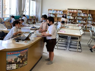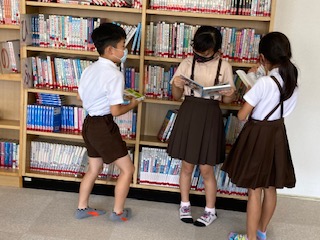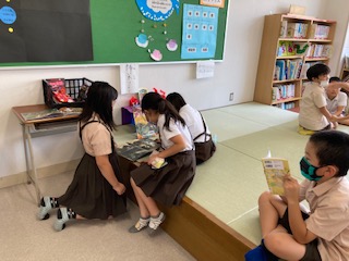 今学期最後の図書の時間です。好きな本を選んだら友達と一緒に読んだりしています。今年の夏休みは、一人5冊まで借りることができます。
