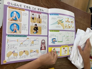 教科書に自分でできること図鑑が載っています。雑巾の絞り方や靴紐の結び方などです。