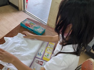 みんなで体操服のたたみ方を練習しました。上手にできています!