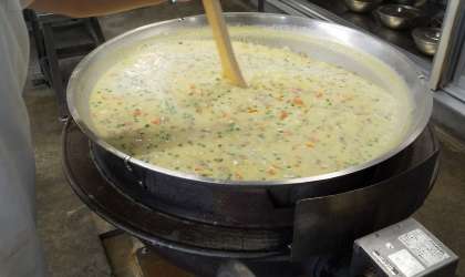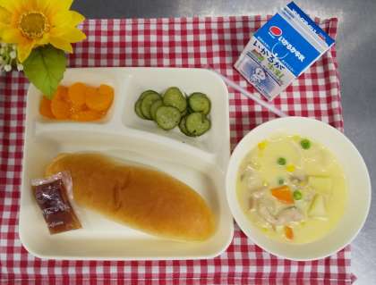 今日は、コーンクリームシチュー、きゅうりのバジル風味サラダ、みかん(缶詰)、コッペパン、いちごジャム、牛乳でした。給食のシチューは小麦粉を使ってルウから手作りしています。うま味たっぷりで子どもたちにも大人気です。