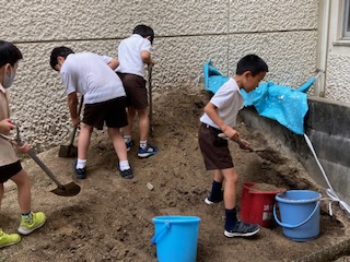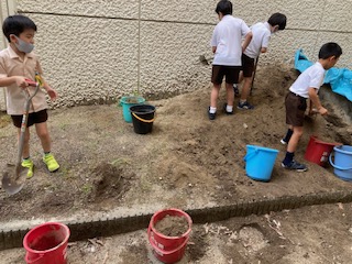 1年生の前の土置き場の土を、バケツに入れる作業を手伝ってくれました。よく働く2年生です。ありがとう!
