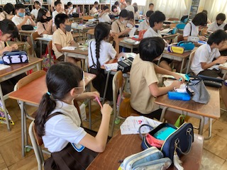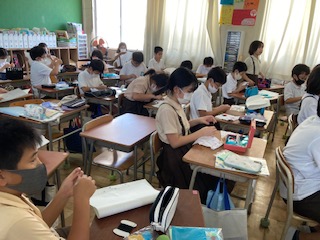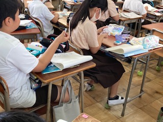 テスト返しと、玉結び、玉止めのテストをまだ受けていない子たちが挑戦しました。簡単な縫い取りの仕方などを使って夏休みに小物作りに挑戦してみては?