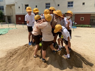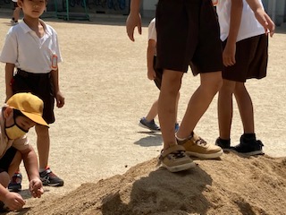 運動場に山土が届きました。山に上って遊んでいます。何人上れるかな?でも蜜を避けるため、すぐに下りました。身近な物をすぐに遊びに生かして楽しめる2年生です。