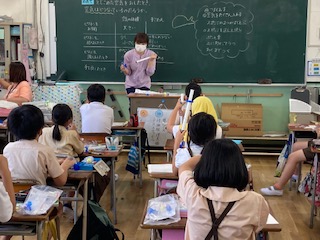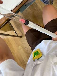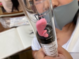 「とじこめた空気をおしたら、空気はどうなるのか」実験をして考えました。発泡スチロールでできたくじらが、ピストンな中に入れて、ピストンを押すと、空気と一緒に押されて小さく縮むことを発見しました。
