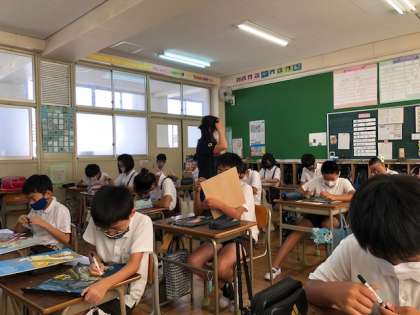 1学期に色付けをした「浮世絵」の多色刷版画の仕上げをした後、鑑賞会をしました。