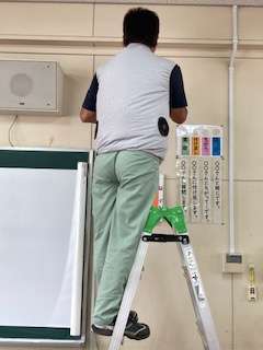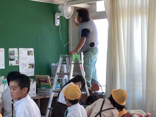 教室には、空気を循環させるために扇風機が4台ずつ取り付けてあります。不具合があったり、不足している教室に管理作業員さんが付けてくれました。