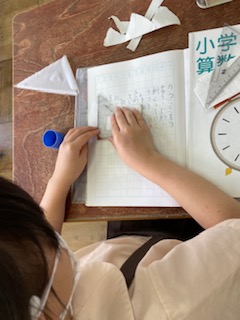 三角定規を使って、直角を探したり、三角形を直線で切り取ってできる形について調べ、考えました。身の回りには、直角のものがたくさんありますね。