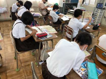 戦国時代に入りました。資料集で長篠の戦いの挿絵を手がかりに、連合軍と武田軍の戦い方の違いについて気付いたことをノートに書き出し、それをグループで交流しました。