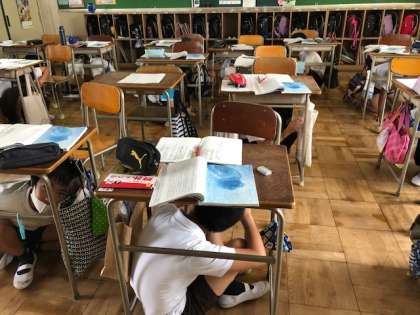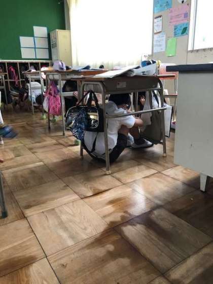 大阪880万人訓練の地域の訓練放送に合わせて、授業中に机の下にもぐりました。頭を守るよう、ランドセルや帽子など、近くにあるもので落下物から身を守るということを学びました。