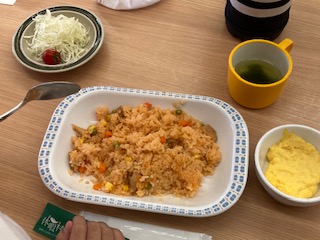 チキンライスとスクランブルエッグ、サラダ、ワカメスープです。