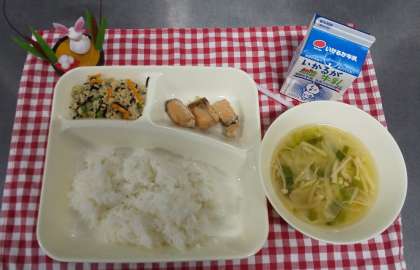 今日は、さけのしょうゆ風味焼き、五目汁、高野どうふのいり煮、ごはん、牛乳でした。鮭の身はサーモンピンクですが、これはアスタキサンチンという抗酸化物質の色素の色なので赤身ではなく白身魚です。鮭の脂肪には血液の流れをよくするEPAや脳の働きを助けるDHAが豊富です。他の白身魚に比べて油がのっていてうま味が多いのが特徴です。