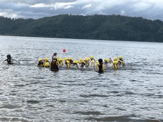 いかだを片付けた後、みんなで輪になって入り水遊びです。