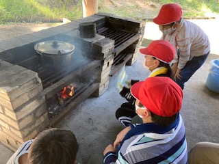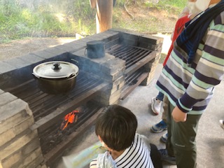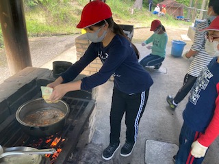 野菜が柔らかくなってきたので、ルーを入れました。あれれ、火が弱くなってきたからみんなで協力して火をおこそう!