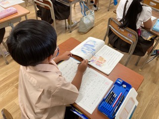 「かいがら」というお話を勉強しています。自分が一番良いなあと思ったところや、好きな登場人物についての感想を書きました。