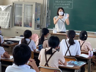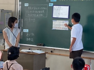 分母が同じ分数の計算は、今までに学習しています。今日は、分母が違うので、ちょっと戸惑いました。分母と分母、分子と分子をたしたら良いという考えも出ましたが、実物のたした牛乳の量を見てちょっと違うことに気づきました。