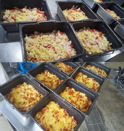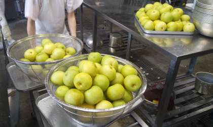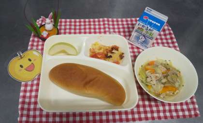 今日は鶏肉とてぼ豆のスープ煮、じゃがいもとトマトのチーズ焼き、なし(二十世紀)、黒糖パン、牛乳でした。塩こしょうをしたじゃがいもとベーコン、トマトの上に細切りチーズをのせて蒸し焼きにしたチーズ焼きは人気の献立です。ご家庭ではフライパンでも作れます。今が旬の梨は約120個を食べやすく用意してくれました。1・2年生は皮も剥いています。