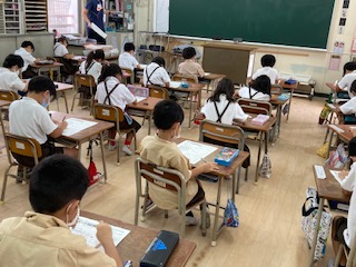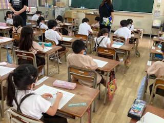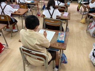 国語、算数の復習テストをしました。一生懸命考えています。