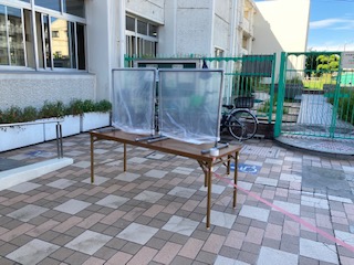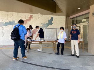 10時まで地域の防災対策会議、シユミレーションを行っています。コロナ対策を兼ねた受付の仕方について、地域防災担、大阪市、区役所担当の方々が準備をされています。
