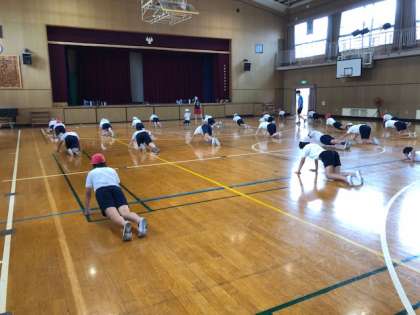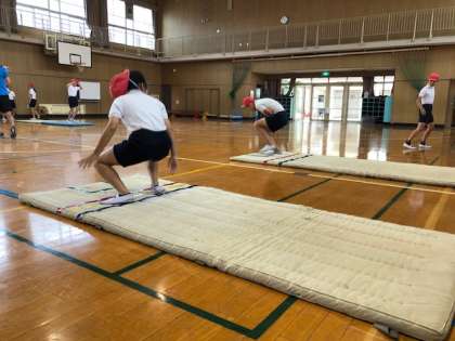 今日は新たな技として「とび前転」を学習しました。上手な友達や先生の手本を参考に、何度も練習しました。